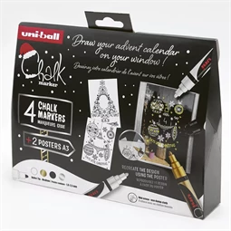 Folyékony krétamarker készlet, karácsonyi 4db/csomag UNI PWE-5M 1,8-2,5mm hegy fehér, fekete, arany, ezüst